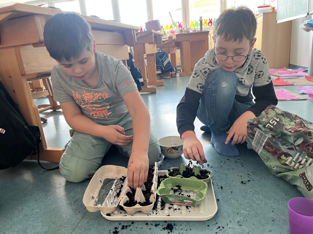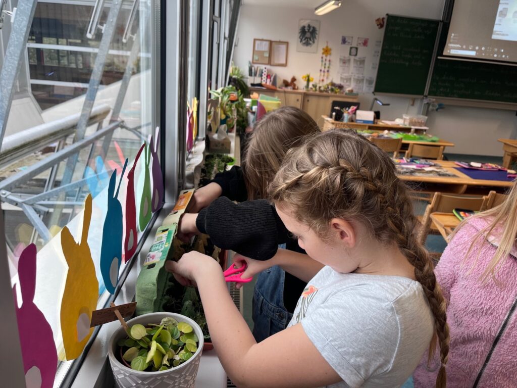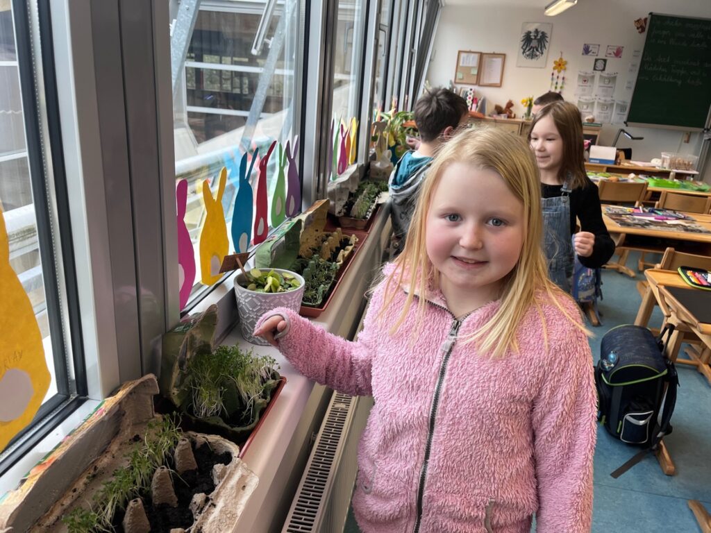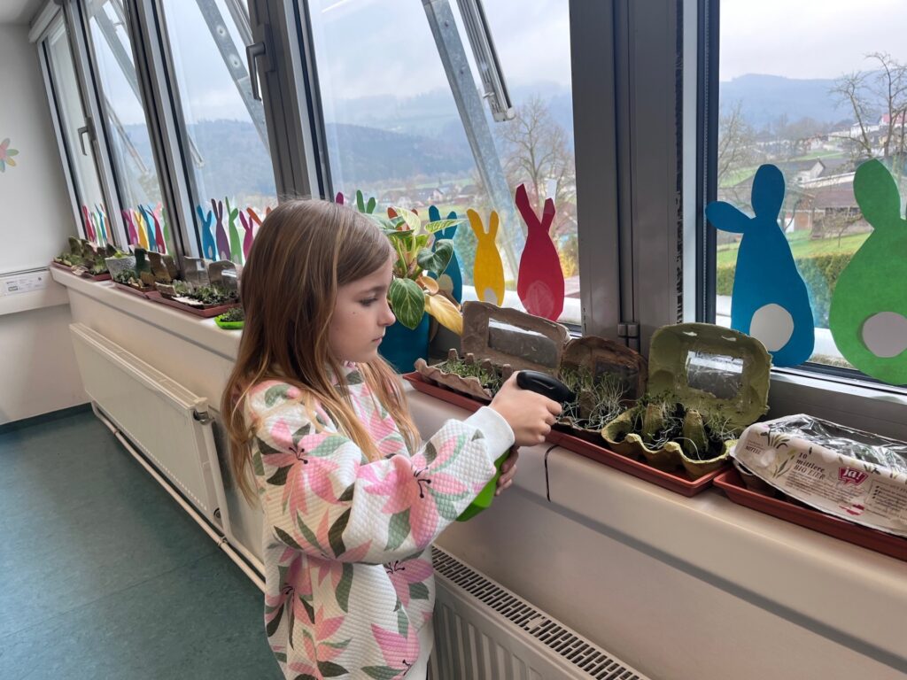 Die 2b Klasse kreierte ihr eigenes Mini-Gewächshaus und freut sich jeden Tag, wenn sie am Fensterbrett den Samenkörnern beim Wachsen zuschauen kann.